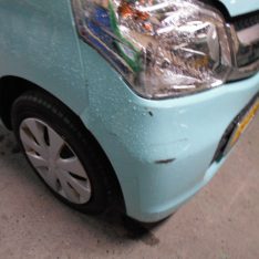浜松市在住のお客様からお車修理の件でご連絡いただきました。スズキ・スペーシアをお乗りのお客様、運転中ハンドルの操作を誤り障害物に激突。右フェンダー・フロントバンパーにキズ・ヘコミが出来てしまいました。